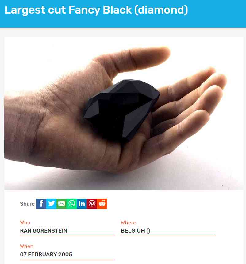这是一颗极其罕见的碳酸盐型黑色钻石,原石至少拥有十亿年的历史,2005年在委托人Ran Gorenstein的要求下,切割后总重达555.55克拉,拥有55个刻面。Ran Gorenstein是一家金融科技公司的联合创始人,业务主要涉及钻石批发数据分析,业内推测本次的卖家很有可能就是他。