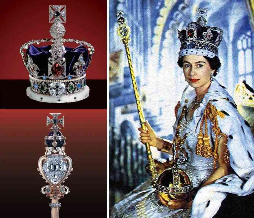 帝国王冠正面不但有一颗重达170克拉的“黑王子尖晶石”,还有一颗“库里南二号”钻石,64面方形、重达317.4克拉;而个头最大的“库里南一号”,74面水滴型、重达530.2克拉,则是被镶嵌在权杖上。