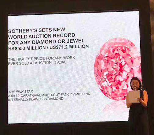 去年在佳士得香港压轴登场的这枚15.81ct枕形艳彩紫粉红钻“The Sakura Diamond”,2.26亿港币的成交价堪称天价,由佳士得亚太区珠宝部主席石丽华(Vickie Sek)替客户投得,成功刷新紫粉红钻拍卖记录↓