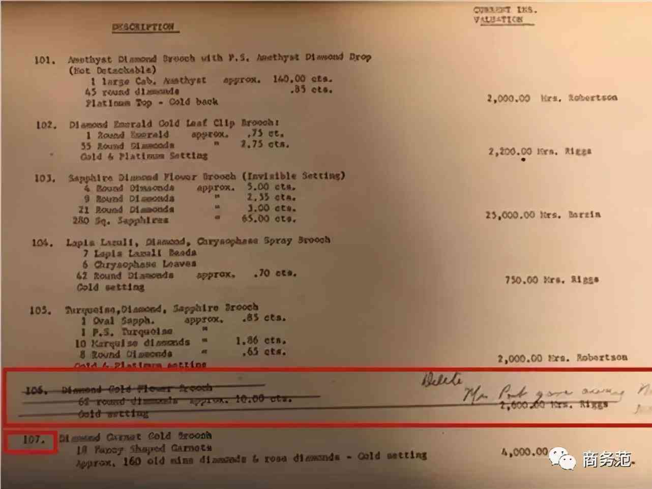 在1920到1960年间,Post经常和卡地亚家族三兄弟中的Pierre直接联系交易,是它家最重要和持久的客户之一。管理她藏品的人员曾经清点过她的库存,粗略翻了翻“珠宝花名册”的其中一页,发现数量已达到107件,而且Post也许是真的太壕,有些珠宝还被她转手送了出去(红框标注)…