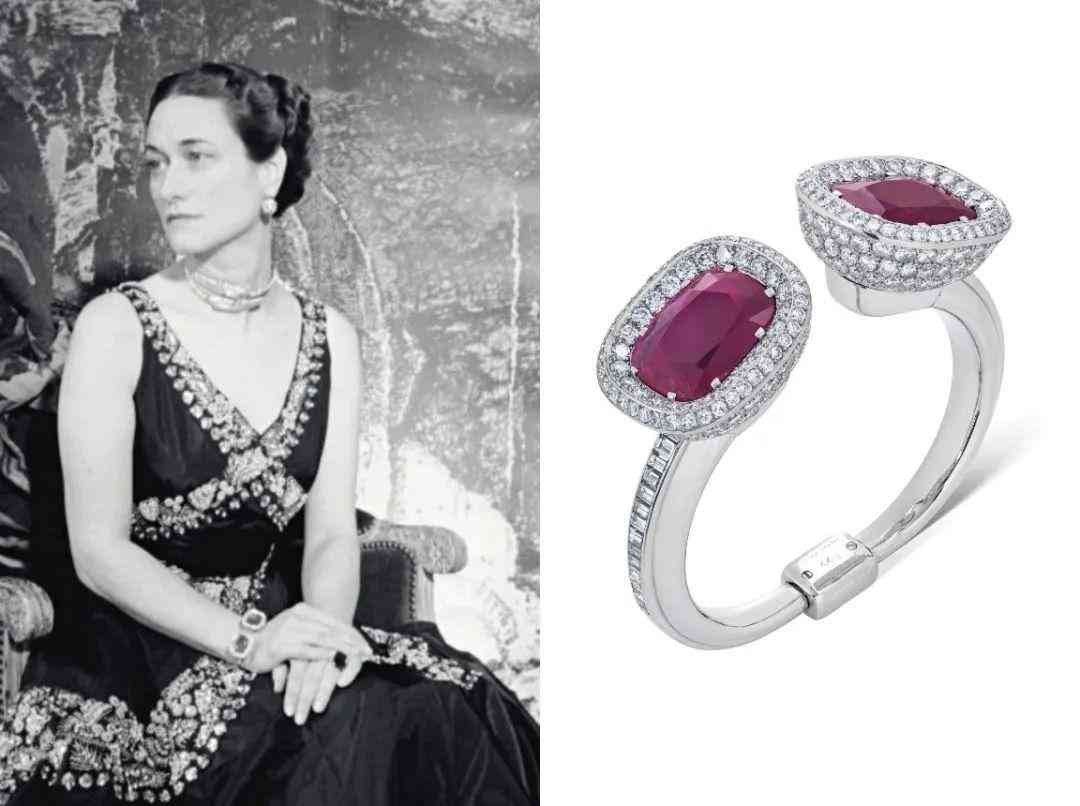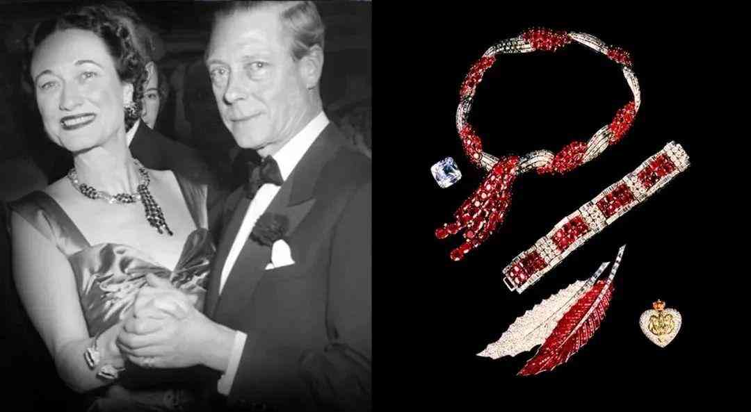 结婚40周年是红宝石婚,爱德华特意在沃利斯40岁生日时送上一整套红宝石珠宝套装,其中包括一条Cravate项链(挂钩上刻着:我的沃利斯,来自她的戴维)、一条手链、一枚双片冬青叶胸针,品牌都是Van Cleef&Arpels;还有一枚Cartier的胸针。