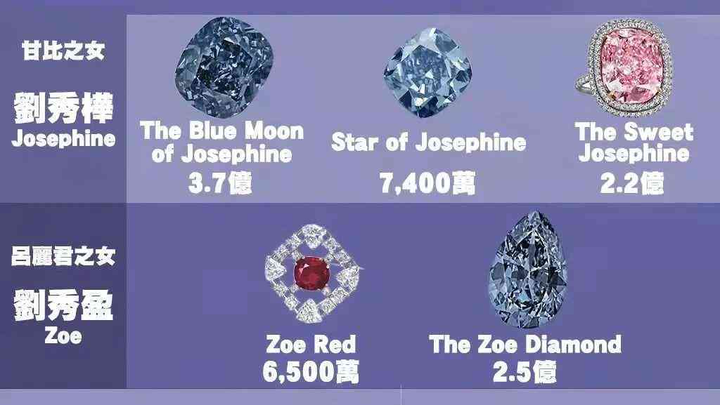对待与吕丽君所生的女儿刘秀盈Zoe,大刘也连送两颗“女儿名巨钻”以表父爱:2014年在纽约苏富比豪掷2.5亿港币买下一颗9.75克拉艳彩蓝钻,将其命名为“The Zoe Diamond”;同月在香港佳士得以6508万的价格买了一粒10.1克拉枕形缅甸天然鸽血红红宝石,命名为“Zoe Red”↓