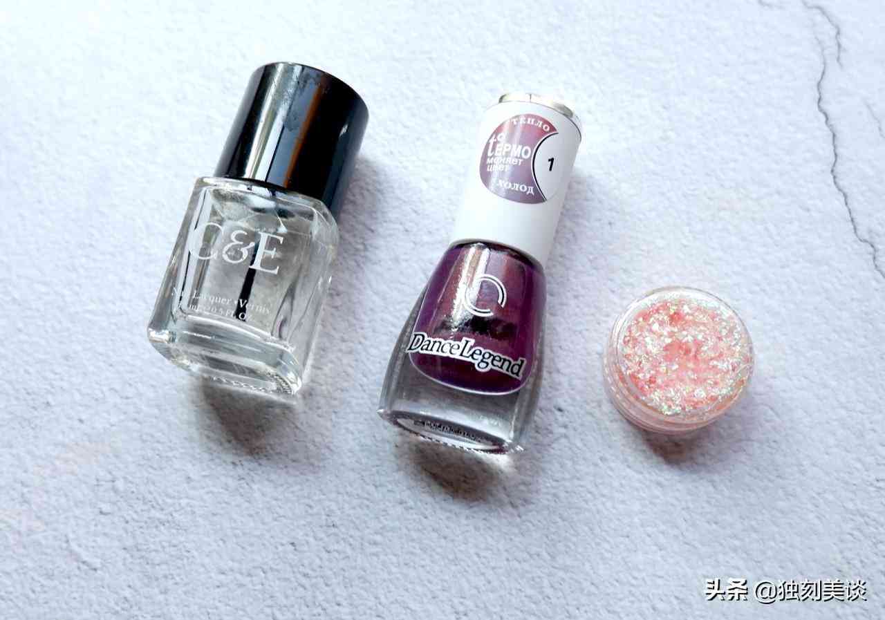 一瓶透明甲油,最好是速干的顶油一瓶速干底油,选择自己喜欢的颜色一款玻璃糖果纸亮片,要考虑和底油的色彩搭配为了用作演示效果,我选择了颜色较深的底油——「DanceLegend」温变甲油,玫红色-深紫色,根据温度而变化;搭配了橘粉色带绿偏光的亮片。