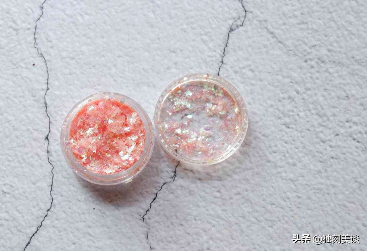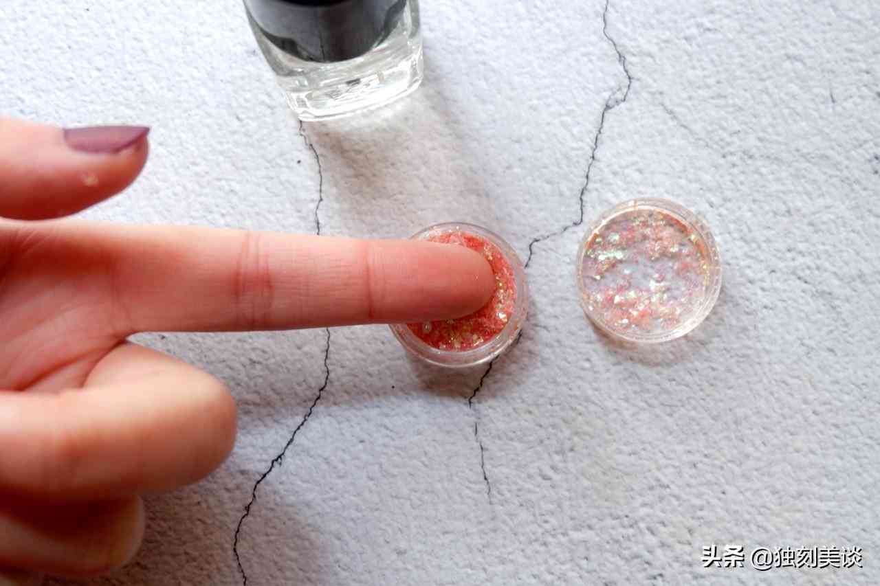 这种亮片可以很碎、很薄,所以蘸取的时候不必担心量少,很可能都叠在一起了。