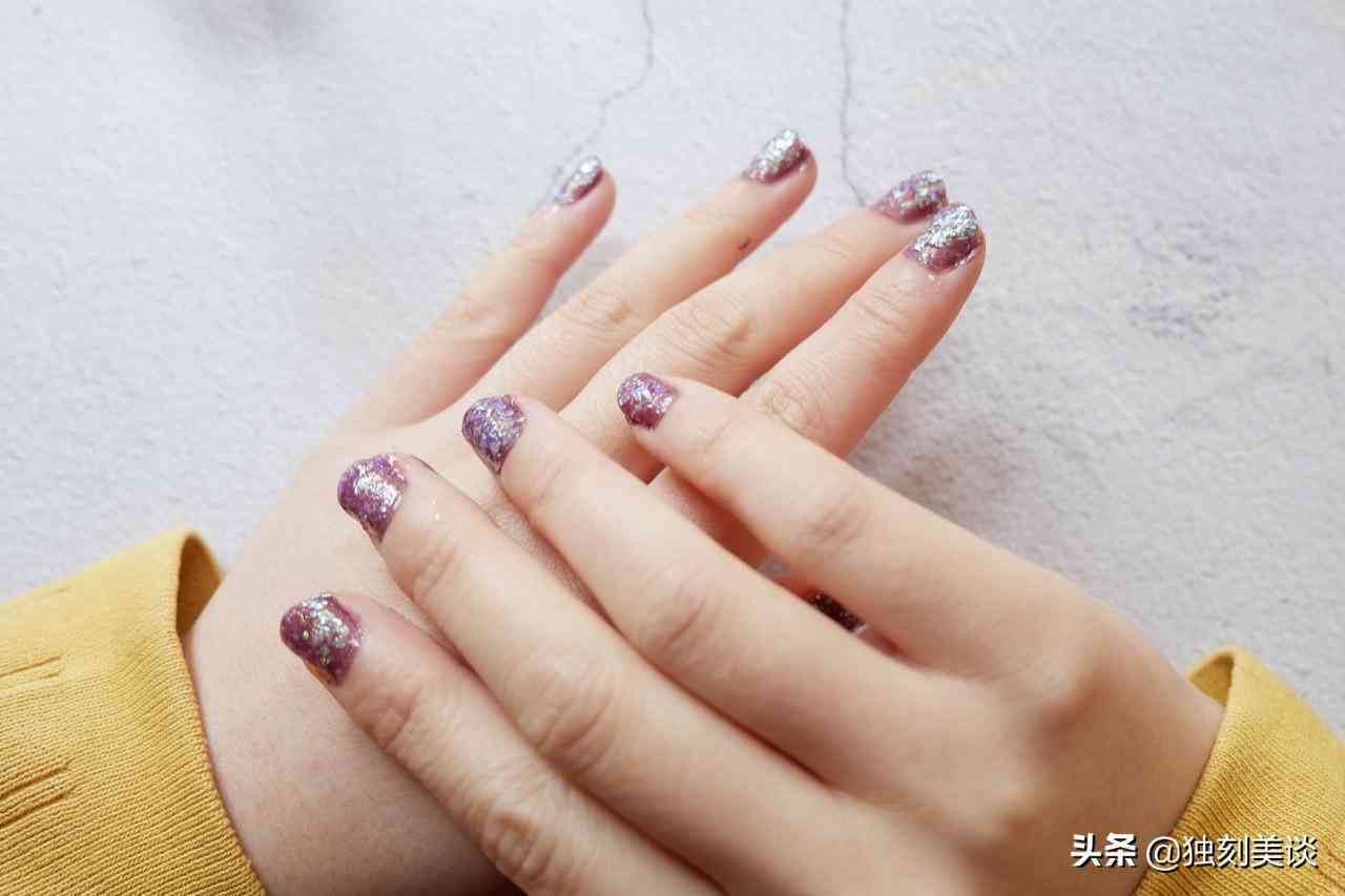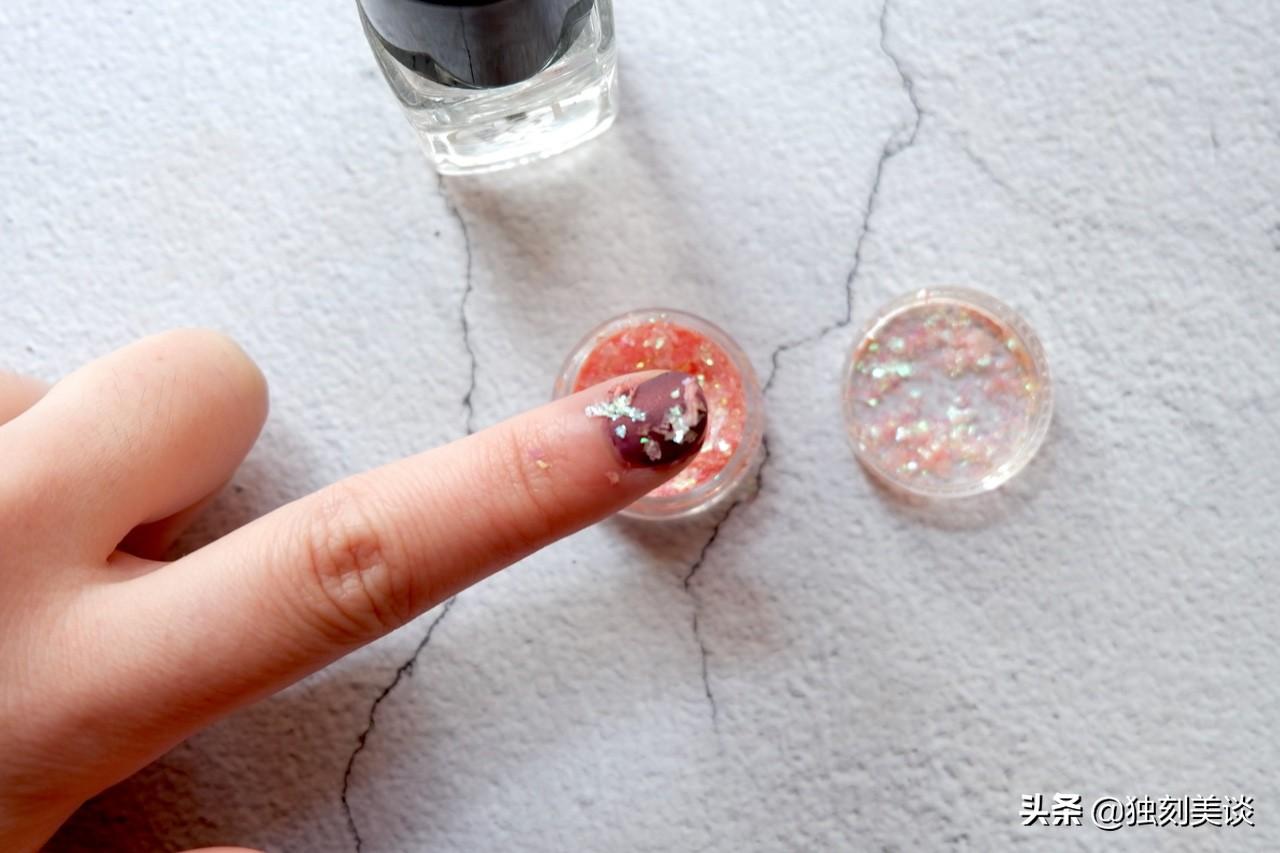 其实这种亮片涂得越轻薄越好,如果是薄薄的亮片均匀地铺了一层,就能呈现“低调奢华感”。
