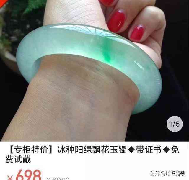 比如说上图这个商品链接,配图中的飘花翡翠手镯看着便通透,似乎还不错,但标题却有点不对劲。