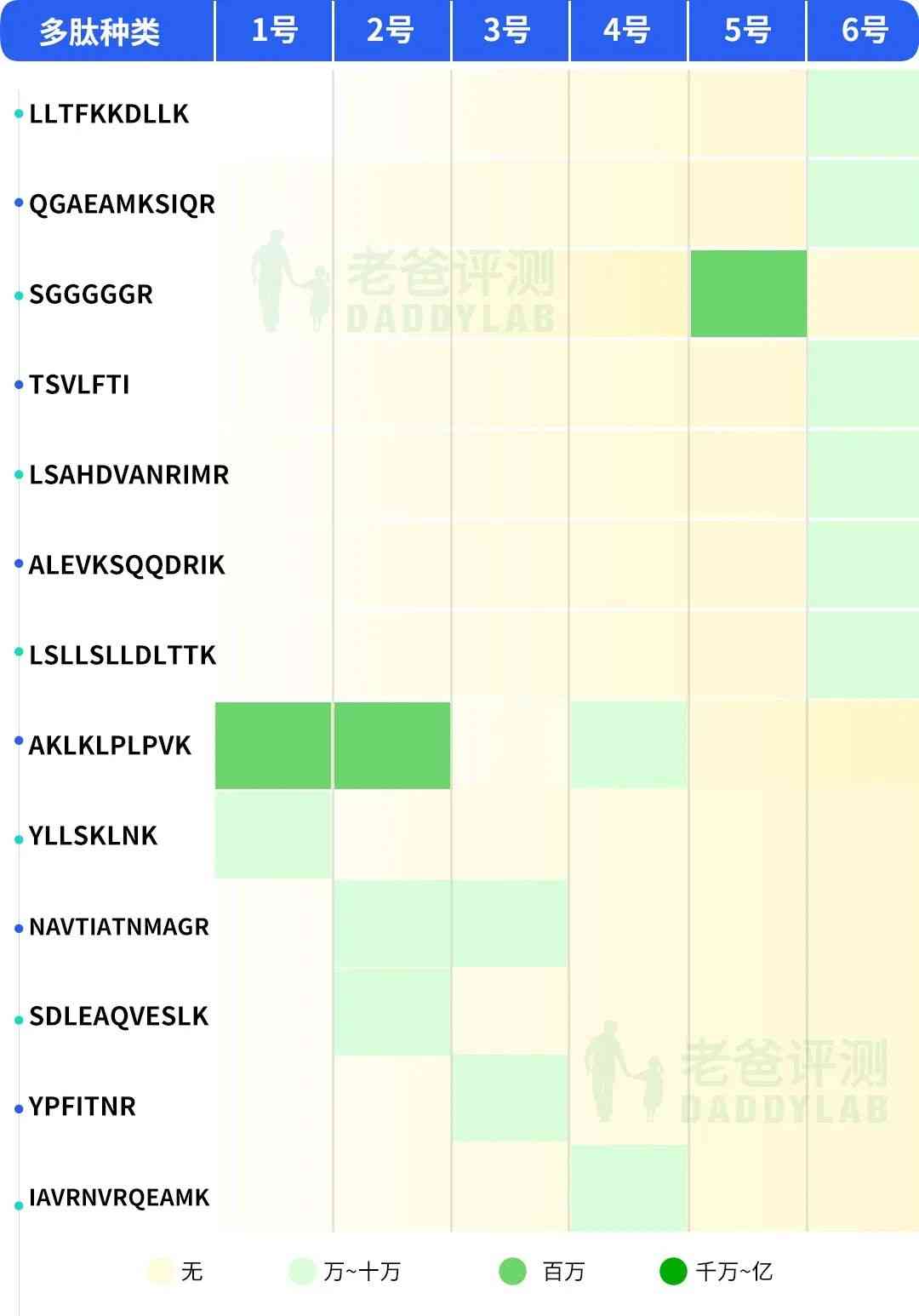 再来看看 6 款原料的多肽种类和含量。同样,色块由浅到深,表示响应值越高,多肽含量越高——