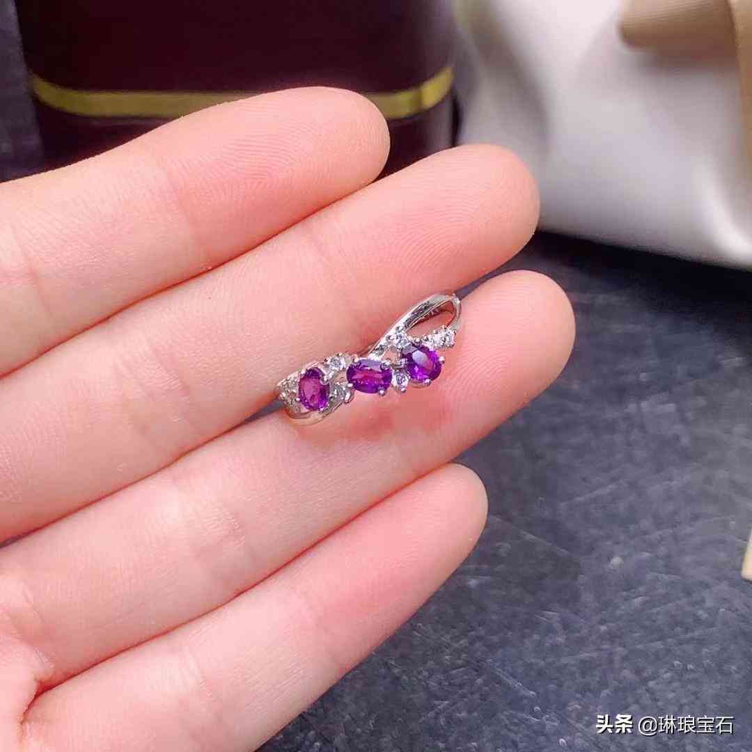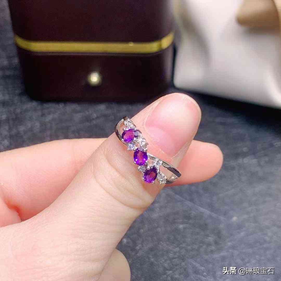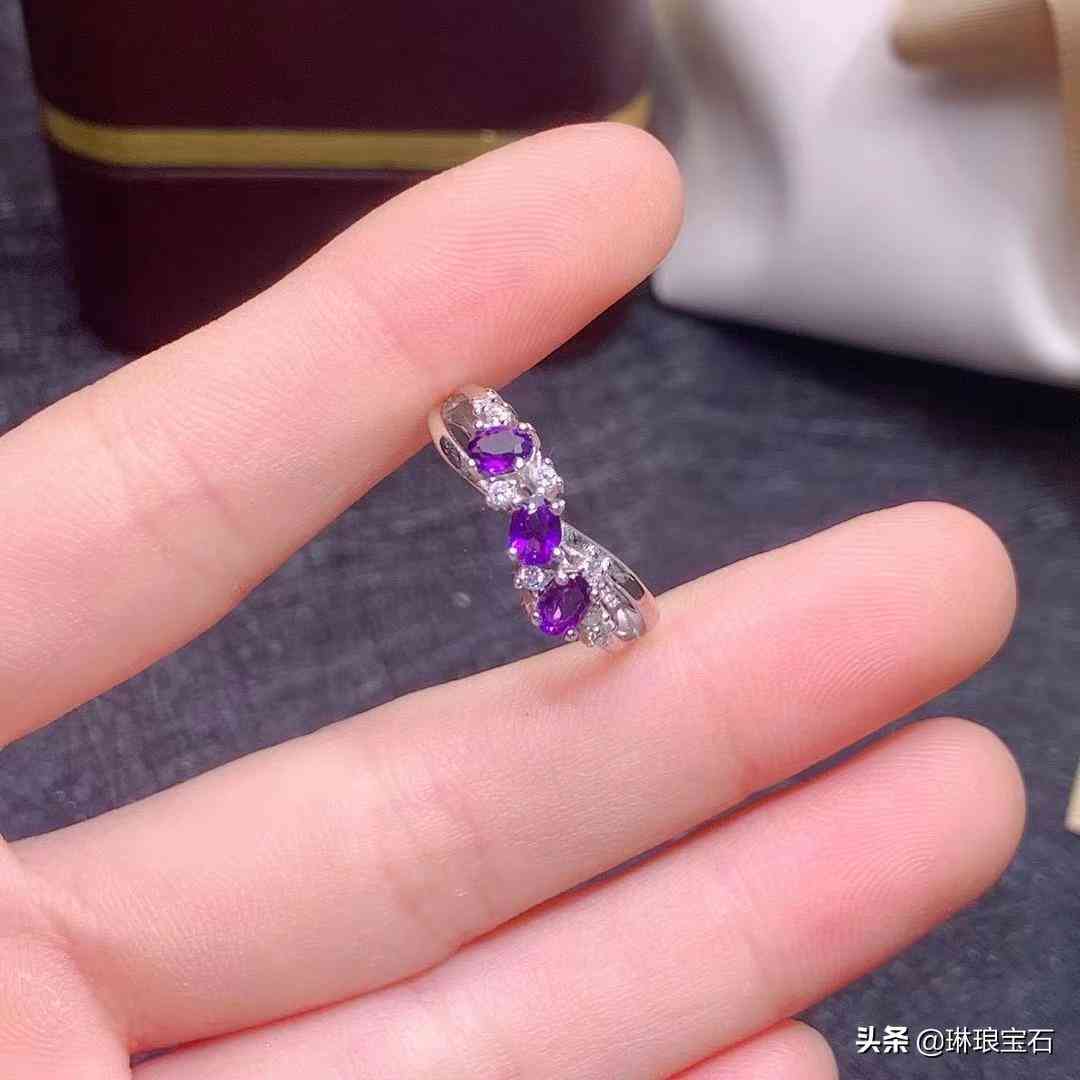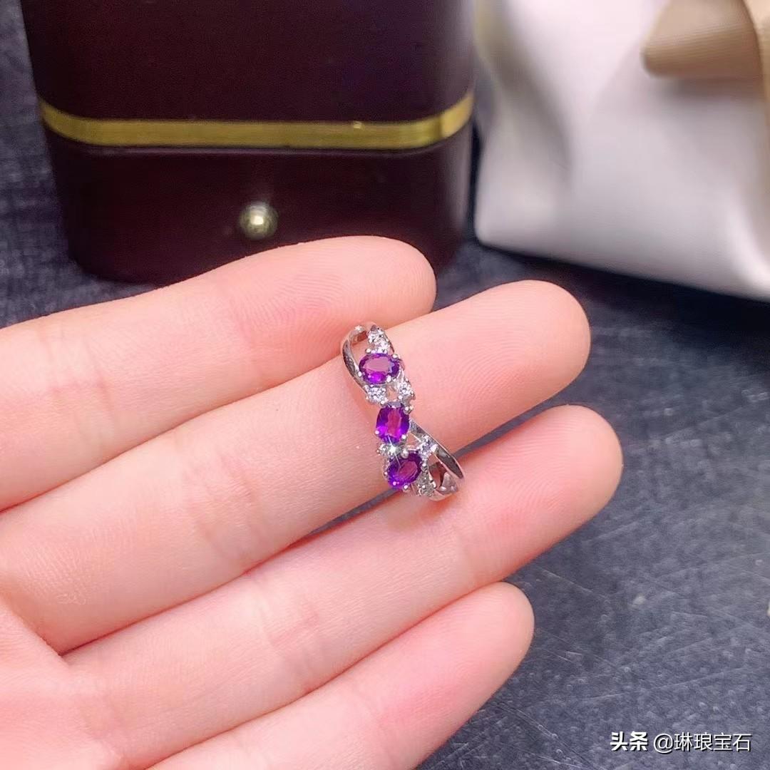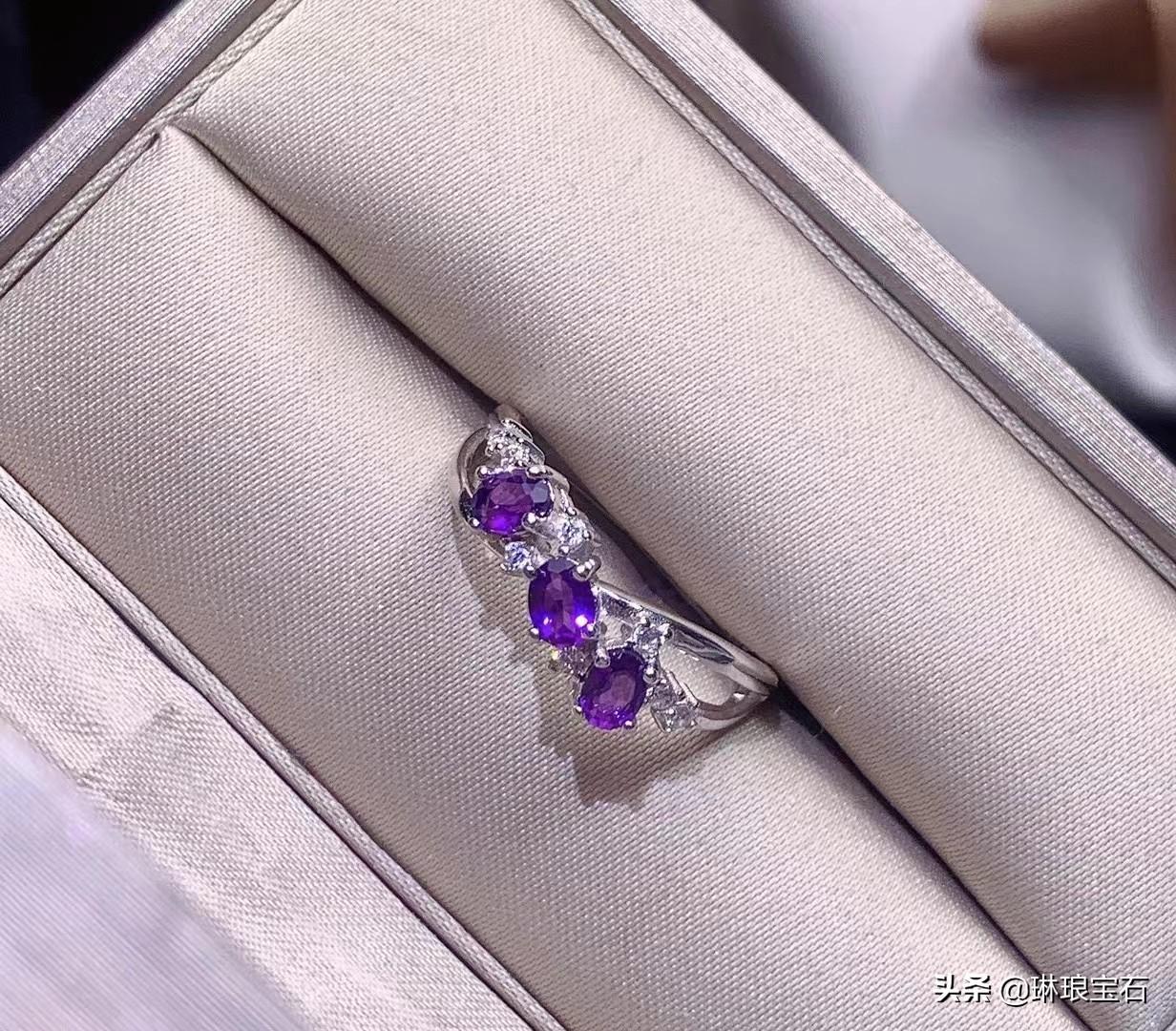 简约却很有设计感的款式,925银的戒托,镶嵌着三颗紫水晶,椭圆的切割,排列有序,每一颗紫水晶旁都镶嵌着闪耀无比的小钻石,在灯光的折射下非常的迷人且闪耀。无论搭配正装还是休闲装都是非常合适的。