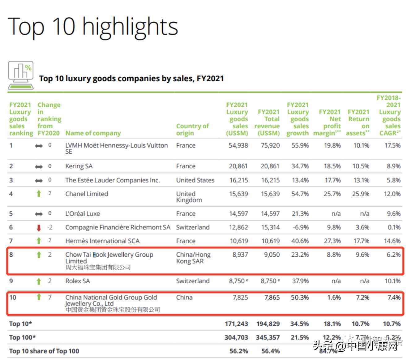 根据德勤(Deloitte)近期发布的.《2022年全球奢侈品力量》(Global Powers of Luxury Goods 2022)报告,周大福和中国黄金成为唯二进入全球十大奢侈品公司行列的中国企业,排名低于LVMH、开云、雅诗兰黛和香奈儿。值得注意的是,周大福、中国黄金的排名分别上升了2位和7位。