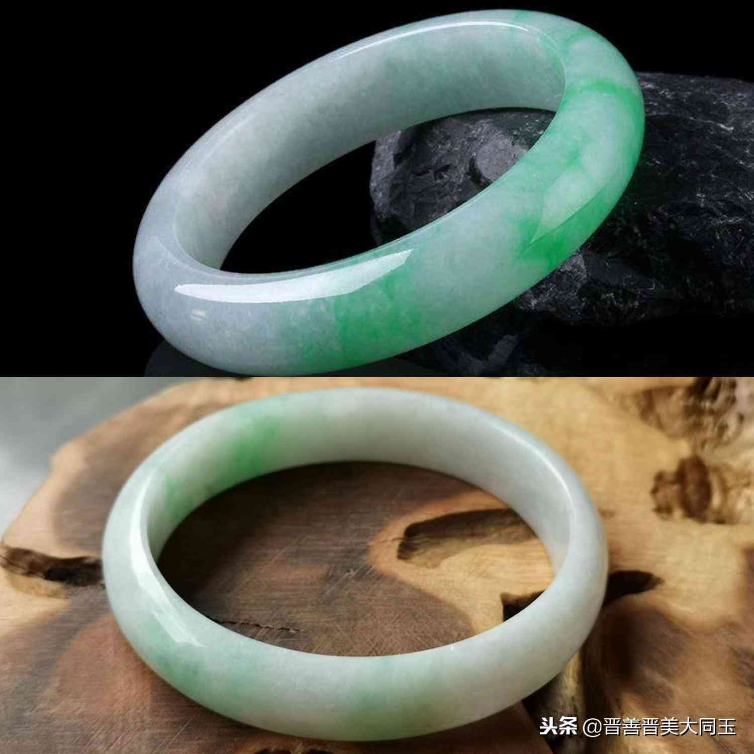 绿色以它那娇翠欲滴的风采为广大珠宝爱好者所喜爱,看色讲究的是“浓、阳、正、俏、和”这五个要点;“ 浓” 是指翡翠的颜色要鲜浓,“ 阳” 是指黄味要足够, “ 正” 是指色泽纯正, “ 俏” 是指十分美丽, “ 和” 是说色彩均匀、饱和度要够,好的颜色应该是艳丽夺目的,如果颜色过浅或过深都会影响到翡翠整体鲜亮度,颜色的多少同样也会影响翡翠的价值。下图同样是翡翠手镯,上面品质较好的翡翠,颜色靓丽,下面品质较差的翡翠,颜色浅淡,差别十分明显。