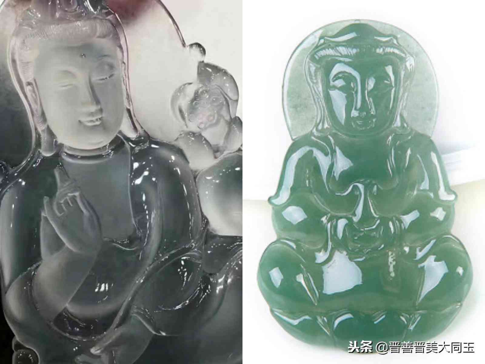下图同样是翡翠观音,左边的一眼看起来就比右边的贵,在同样款式的情况下,左边品质较好的翡翠“种水”很好,通俗一点来说就是很水灵,通透度、起光感好;而右边品质一般的翡翠“种水”很干,不通透,晶体结构比较粗,也就是石性比较重,看起来很瓷实。