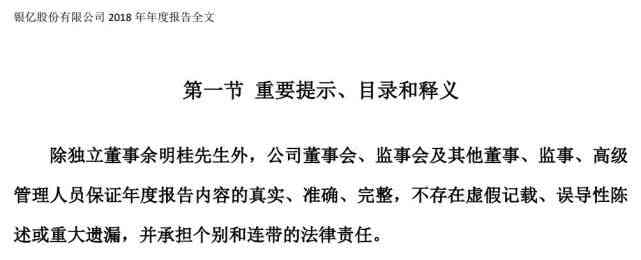 银亿股份2018年年度报告显示:除独立董事余明桂先生外,公司董事会、监事会及其他董事、监事、高级管理人员保证年度报告内容的真实、准确、完整,不存在虚假记载、误导性陈述或重大遗漏,并承担个别和连带的法律责任。