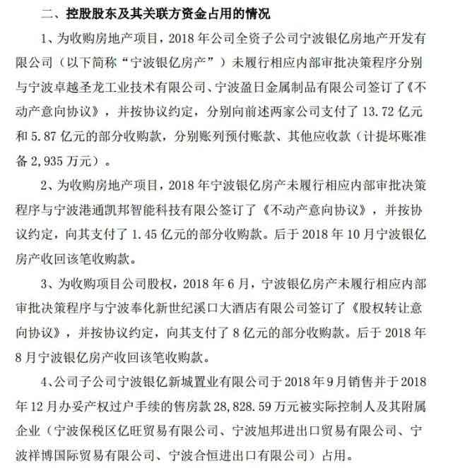 st银亿此前公告,为收购房地产项目,2018年公司全资子公司宁波银亿房产未履行相应内部审批决策程序分别与宁波卓越、宁波盈日公司签订了《不动产意向协议》,并按协议约定,分别向前述两家公司支付了13.72亿元和5.87亿元的部分收购款。