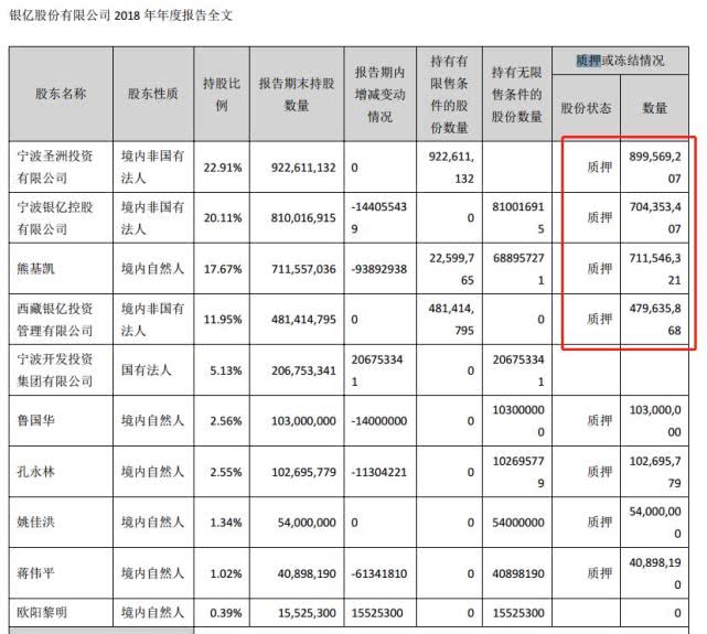 年报显示,截至目前,银亿股份前十大股东中,银亿控股、宁波圣洲、熊基凯、西藏银亿投资、欧阳黎明为一致行动人,分别持有银亿股份22.91%、20.11%、17.67%、11.95%、0.39%,合计为73.03%,其分别质押9亿股、7.04亿股、7.12亿股、4.80亿股,合计占总股本的69.39%,股权质押比为95.02%。
