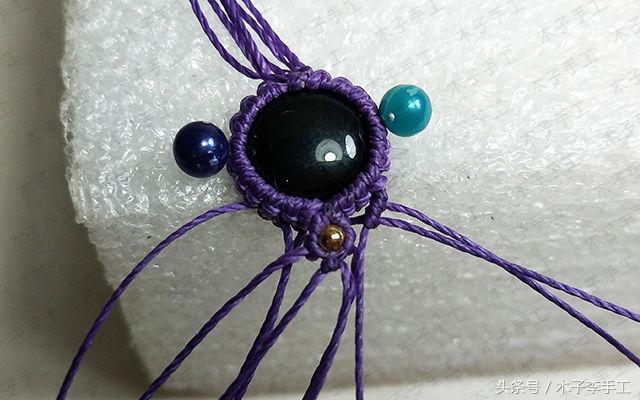 10、包进一颗10mm的圆形练手石,最后的两根轴线也做一个斜卷结,这4个斜卷结的方向要一致,把这4个斜卷结都拉紧一点,石头就不会掉出来