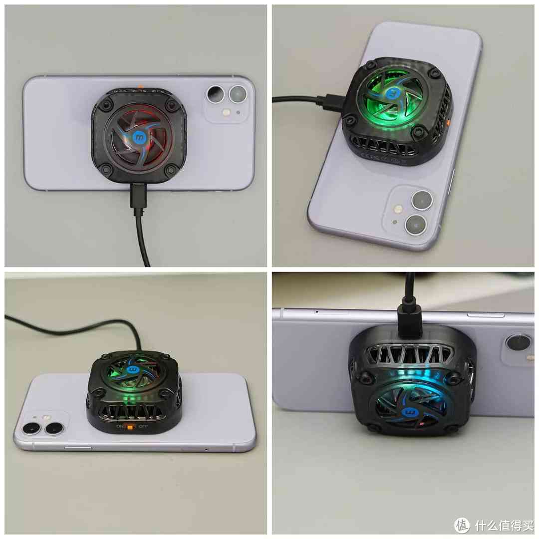 摩米士磁吸散热器顶部和四边都有出风口,同时还自带RGB灯光特效,非常好看,玩游戏的氛围感十足。使用附赠的电源线连接到充电头或者充电宝上,开启散热器开关就可以启动制冷散热了。