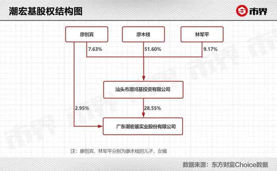 截至2022年一季度,廖创宾家族三人通过汕头市潮鸿基投资有限公司,间接持有上市公司潮宏基19.53%的股权,他以个人身份持有公司2.95%股权。