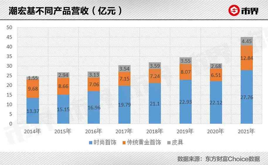 2006年,K金珠宝首饰占潮宏基营收的96%以上,这些年虽然一直在下降,但包括K金和镶嵌珠宝在内的时尚珠宝,依然占公司营收的六成左右。