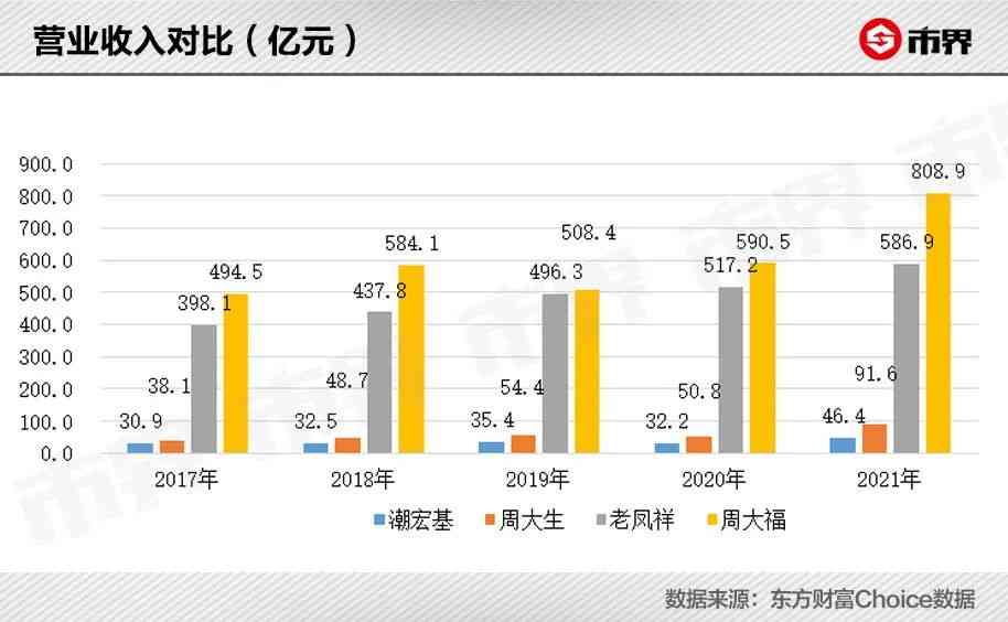 截至2021年,周大生有4502家门店,大约是潮宏基的4.2倍。