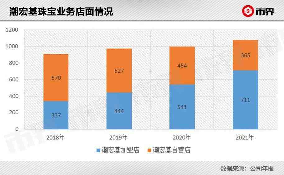 2018年至2021年,潮宏基珠宝业务直营门店减少了205家,加盟门店则增加了374家。