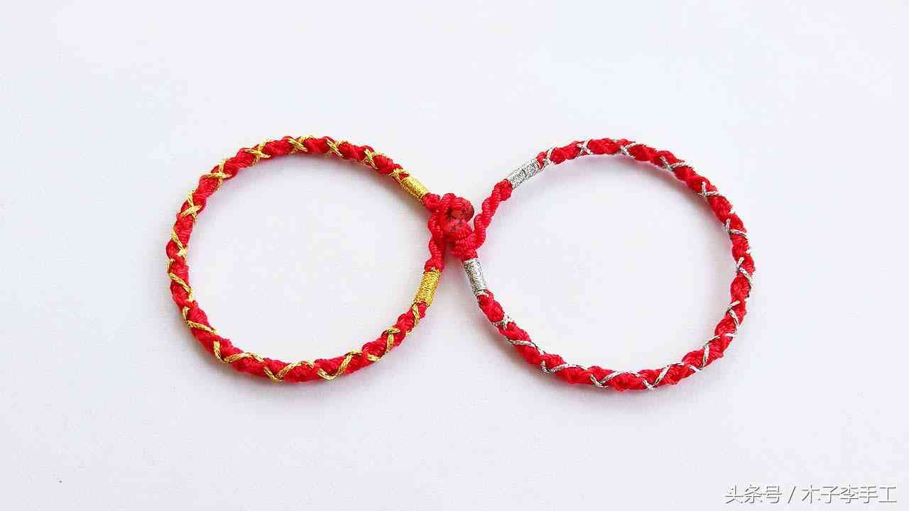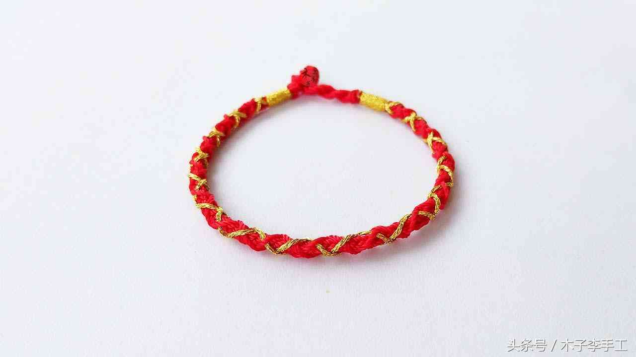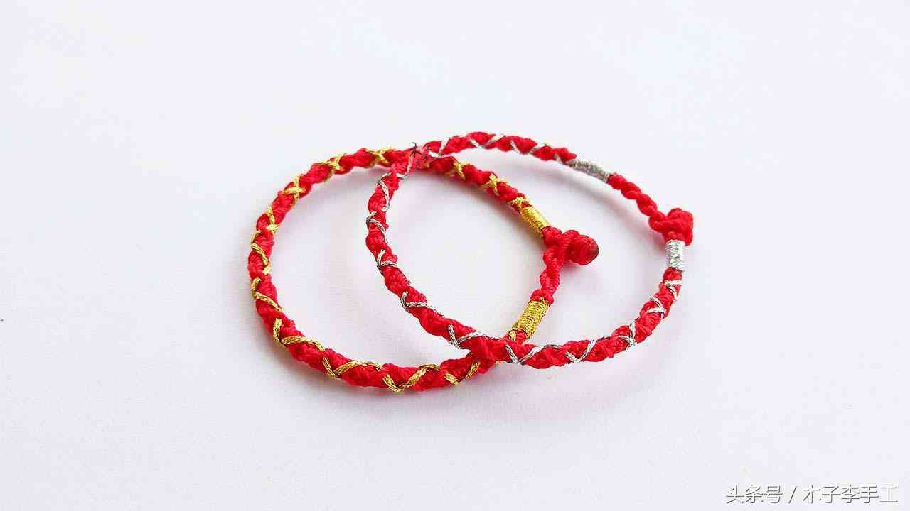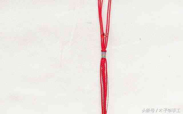 3、把手链倒过来,拉2根红线下来,再另取一根彩金线对折后跟这2根红线并排放好。