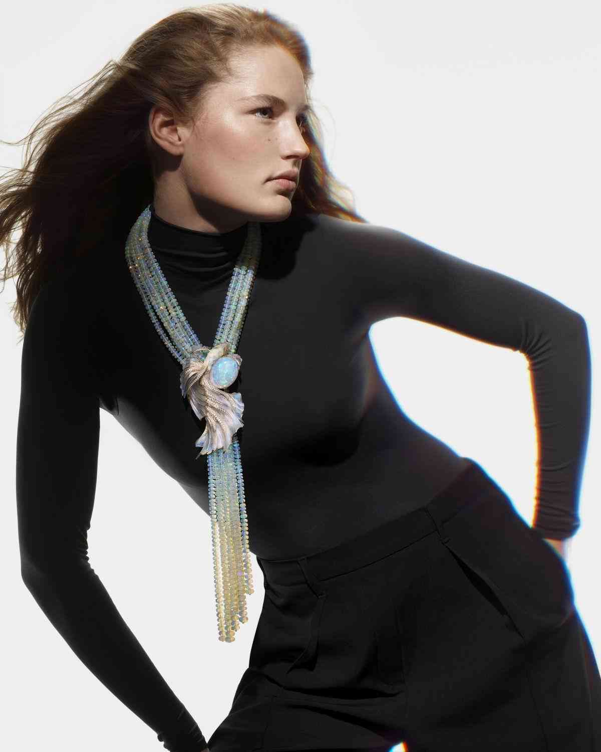 近年来,欧泊逐渐成为高级珠宝品牌的新宠,令人眼花缭乱的变彩效应,成为展现自然生命力的生动元素。在今年卡地亚发布的全新BEAUTÉS DU MONDE高级珠宝系列中,设计师就再次从自然万物出发,演绎寰宇灵感下的万物之美,其中自然少不了欧泊石的流光溢彩。其中的Cordulia胸针呈现了一只振翅欲飞的蜻蜓。蜻蜓的翅膀以一颗20.09克拉黑欧泊打造,虹彩色调宛如阳光下闪烁的翅膀光晕,与周围装饰的白水晶相映成趣,勾勒出令人愉悦的氛围。现场另一条卡地亚高级珠宝项链也采用了欧泊,根据其纹路和色彩,卡地亚最终呈现的完全是另一种风格。