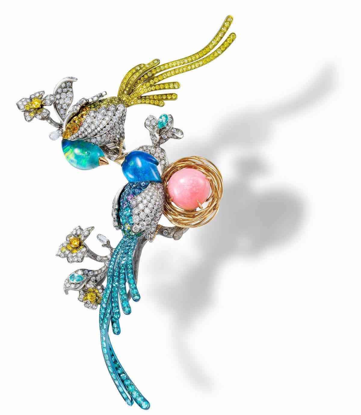 仿佛流动不息的欧泊总是能让人想起鸟雀的蓝色羽毛,珠宝设计师ANNA HU也以此为灵感,用两枚深浅不一的蓝色欧泊石打造了一件蓝鹊情深胸针。这件胸针以极为高难度的钛金属工艺,搭配 18K 白金及玫瑰金,勾勒充满流线感的细致轮廓线条,鹊首以两颗总重 13.50 克拉的欧泊定制雕刻而成。金色鹊巢中拥有浓郁粉色的天然孔克珠重达 14.344 克拉;羽毛和花朵镶嵌帕拉伊巴碧玺、黄钻、橙色芬达石等将近 900 颗宝石,体现林中两只款款情深的蓝鹊,共同守护巢中珍宝的美好寓意。