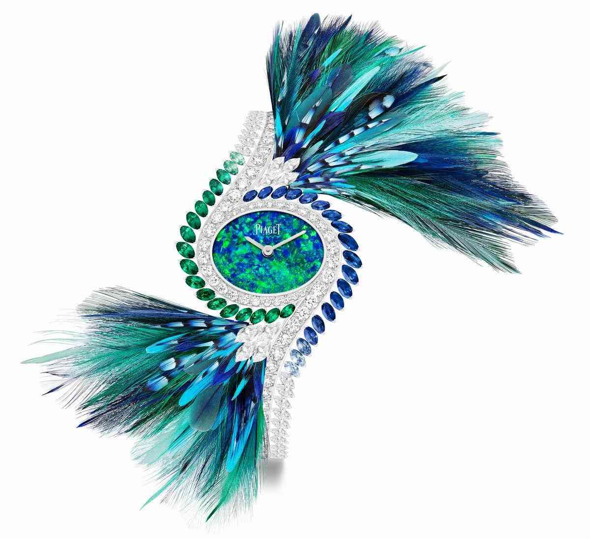 无独有偶,伯爵也在高级珠宝创作中,将欧泊与羽毛元素融合相映。在Solstice系列高级珠宝与腕表新作当中,Extravagant Touch主题腕表以一枚产自澳大利亚的黑欧泊作为表盘和视觉中心,周边环绕着镶饰马眼形切割蓝宝石、马眼形切割祖母绿、马眼形切割美钻和明亮式切割美钻,将黑欧泊的蓝绿色彩晕染蔓延。这枚腕表还搭载了可以拆卸的羽毛钻石配件,可以配合腕表佩戴,也能拆下当做耳环,摇曳生姿。
