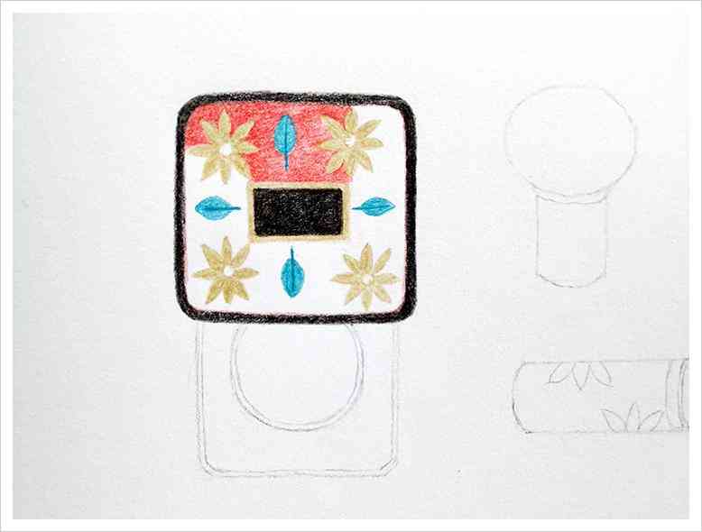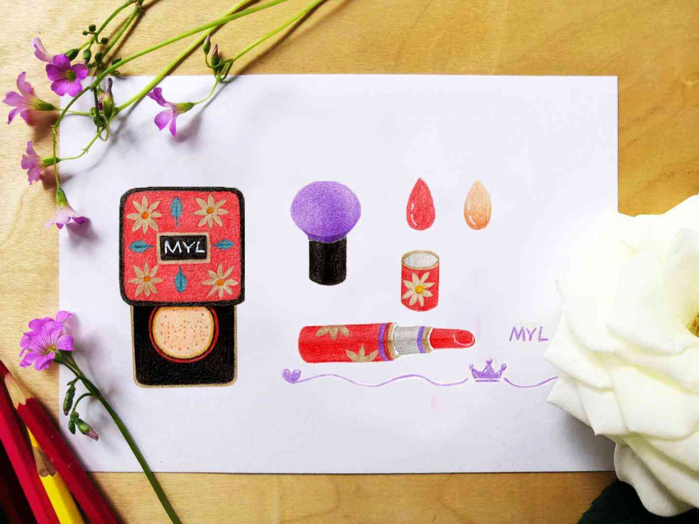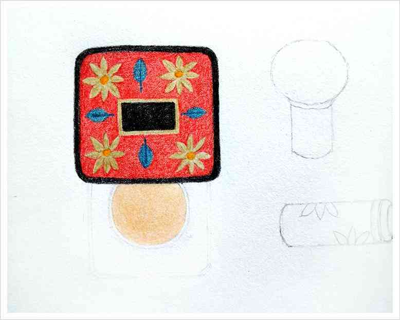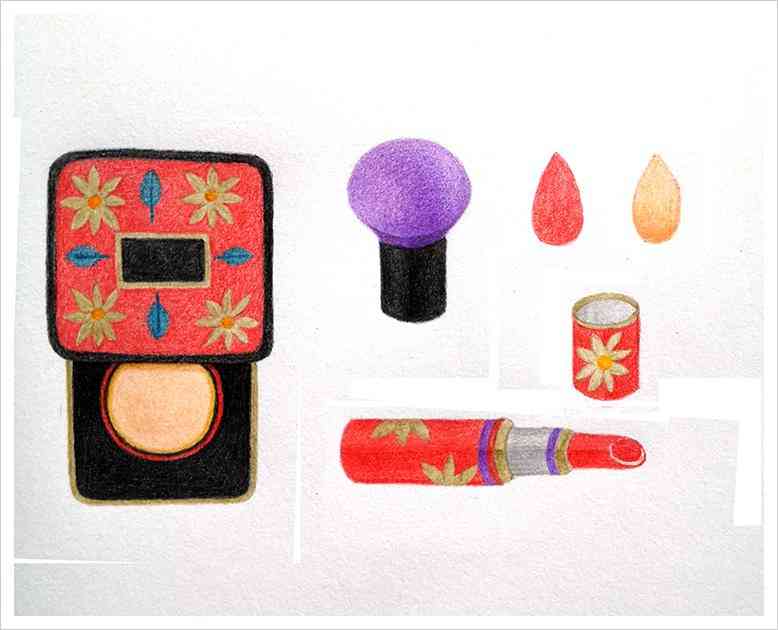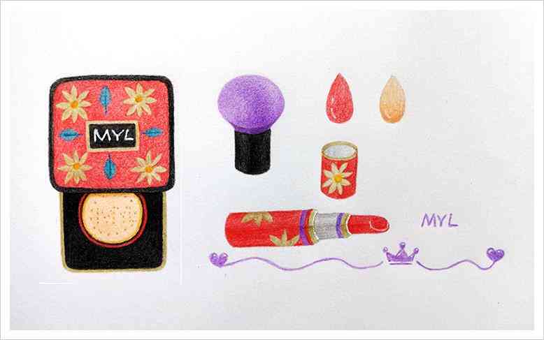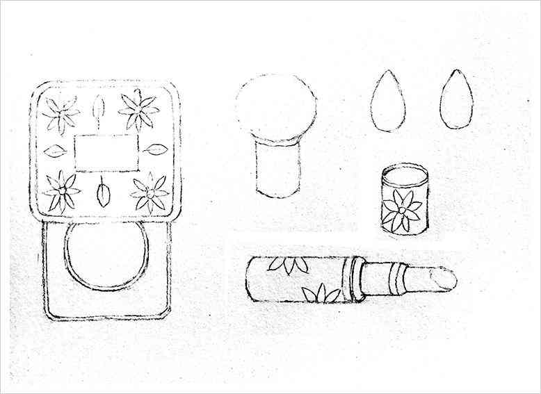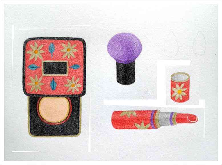 一、在素描纸上用2b的铅笔,画线稿。化妆盒上的图案都需要画出来。