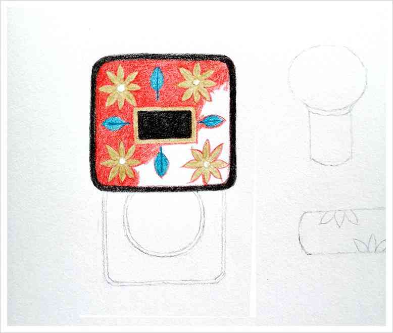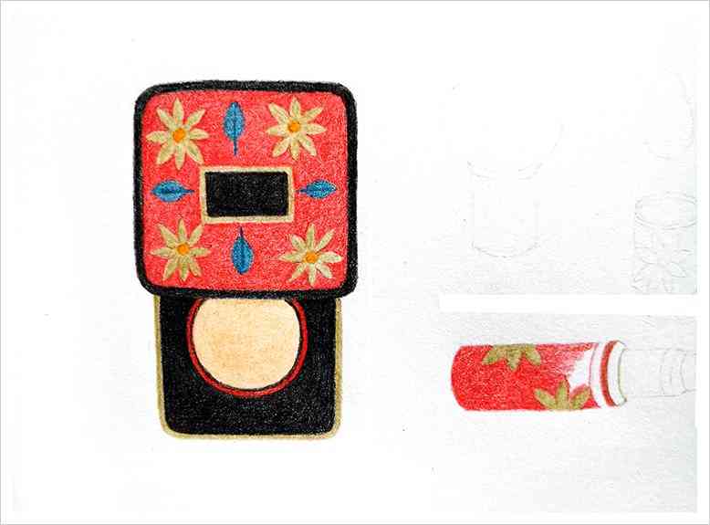 十一、现在把口红的盖子画出来。口红带有颜色和口红的主体颜色是一样的。上面那个花纹和粉饼盒上那个花纹是一样的。