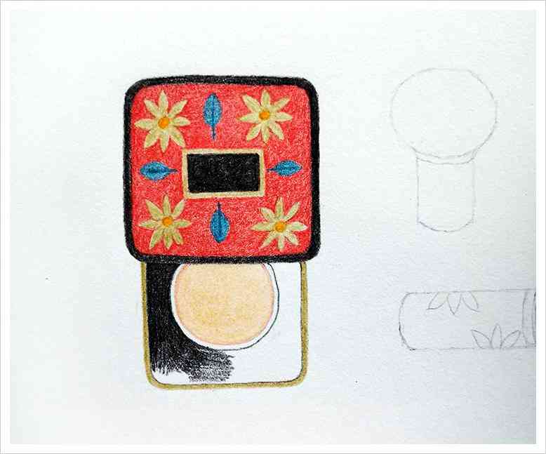 四、化妆盒的表面画好了,下面我们开始画,里面的那块粉饼。这款颜色我选择了用肉色来画。基本上都是平涂,但化妆盒盖子遮挡的那个位置要加深一些。