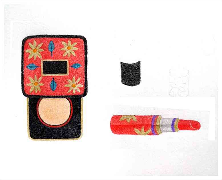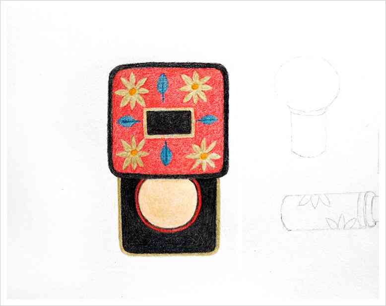 二、化妆盒上的颜色都是比较干净的单色,化妆盒的外面是一层黑色,然后中间的底色是比较正的红色,上面是金色和蓝色的花纹。上色的时候我们可以先把外面的黑色画出来,当然也可以先把中间的颜色画出来,然后最后来画这一圈黑色的。我在画的时候,先把金色和蓝色部分画了,然后画的是外围的那圈黑色,最后上的是红色。这个没有特别的规定,大家根据自己的习惯和喜好来画。