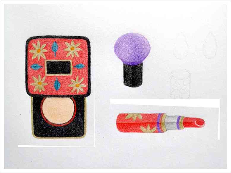 三、这个化妆盒的上色呢,比较简单,因为都是单色的。.要注意的就是在画的时候要,用力均衡一些,不要让颜色深一块浅一块。