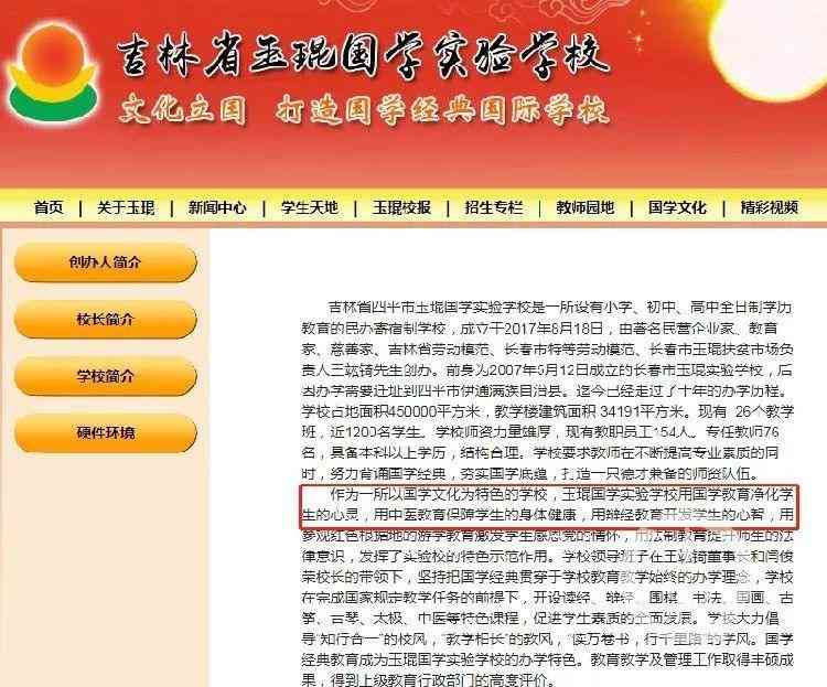 玉琨学校的官网上,写有一段创办人王竑锜的话:“一个没有国学经典修养的人,犹如在茫茫黑夜、乌云密布中迷失方向的人;国学经典是白天的太阳、黑夜的月亮、星辰,更是每个人内心深处那盏希望之灯——心灯。”