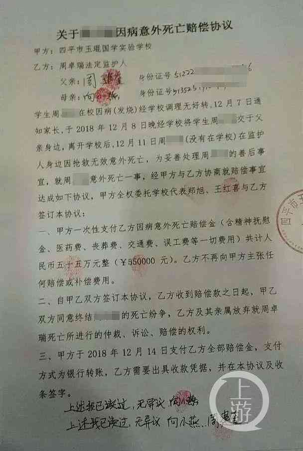 这份《关于睿睿因病意外死亡赔偿协议》显示,双方签署时间为12月14日, 校方一次性支付睿睿父母孩子因病意外死亡赔偿金55万元 ,睿睿父母不再向校方主张任何赔偿或补偿费用,同时放弃睿睿死亡所进行的仲裁、诉讼、赔偿的权利。睿睿父母领取校方全部款项后,不再向校方提出任何异议,不得作出有损于校方声誉的言论,否则须承担相应的法律责任。