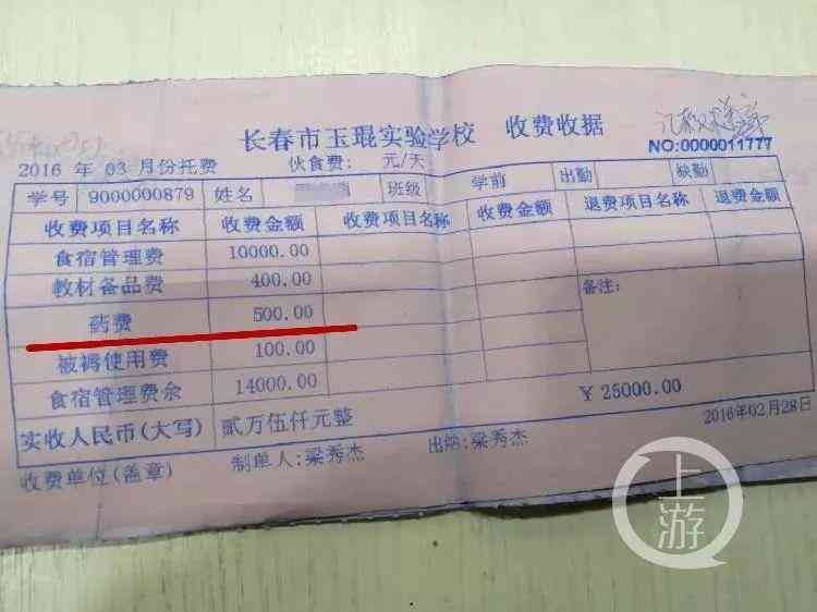 根据周建奎提供的收费票据显示,2016年2月28日,睿睿的学杂费用共计2.5万元,其中一项收费就包括药费500元。