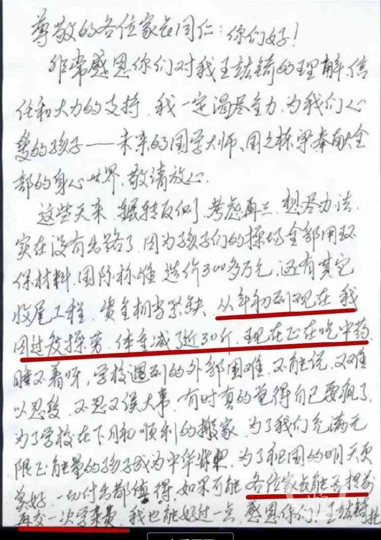 学校工程款遇到问题,创办人写信要求家长提前再交一次学杂费。受访者供图