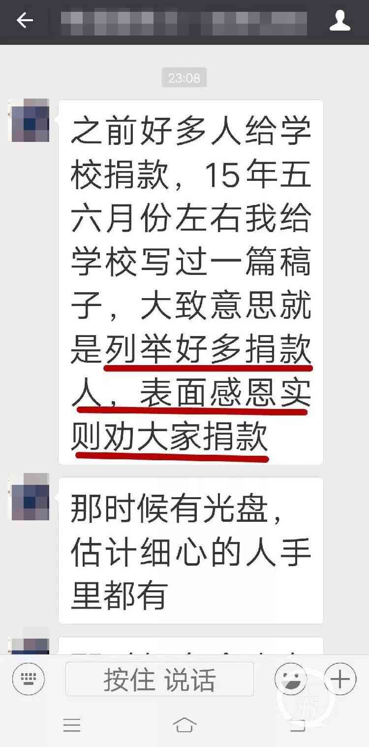 这名老师说,大约在2015年五六月份,她曾给学校写过一篇文章,大致内容是列举出给学校的捐款人,表面上是在感恩,实则是劝没捐款的家长捐款。