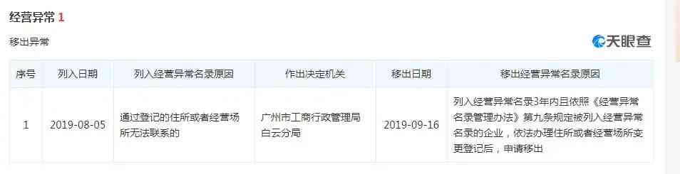 天眼查显示,诗如雅成立于2017年6月8日,注册资本100万人民币,实缴0元,法人张曼如,监事谢妃四,地址为广州市番禺区石壁街屏山二村屏都路1号409。2019年8月5日,因通过登记的住所或者经营场所无法联系被广州市工商行政管理局白云分局列入经营异常名录中,2019年9月16日被移出。