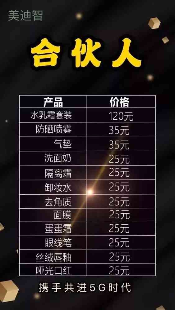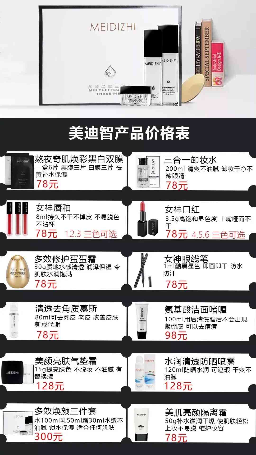 颜值君通过代理商了解到,美迪智品牌有黑白双膜、三合一卸妆水、女神唇釉、女神口红、多效修护蛋蛋霜、女神眼线笔、清透去角质慕斯、氨基酸洁面啫喱、美颜亮肤气垫霜、水润清透防晒喷雾、多效焕颜三件套美肌亮颜隔离霜等产品。零售价均偏于平价,而成为代理后的拿货价更为便宜。