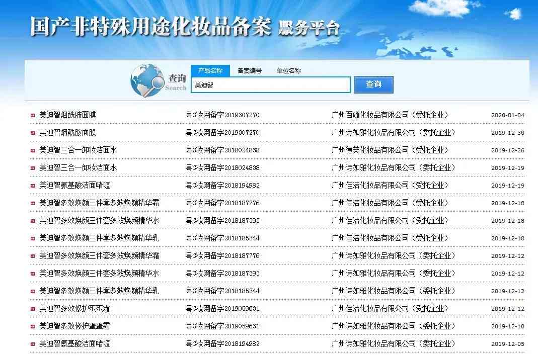 颜值君在国产非特殊用途化妆品备案服务平台查到,美迪智2017年至2018年备案信息均为已注销状态。其委托企业为诗如雅,受托企业有广州百媚化妆品有限公司、广州德芙化妆品有限公司、广州佳洁化妆品有限公司、深圳市萨希曼化妆品有限公司、楚业健康产业(广州)有限公司、广州均衡生物科技有限公司、广州东智盟化妆品有限公司、广州迦心化妆品有限公司。值得一提的是,除楚业健康产业(广州)有限公司外,其余几家公司都有不同程度的行政处罚。