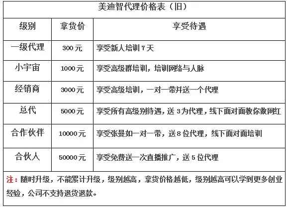 拿货价与享受优惠分别为300元可享受新人培训7天、1000元享受高级群培训,培训网络与人脉、3000元享受高级培训,一对一带并送一个代理、5000元享受所有高级别待遇,送3位代理,线下面对面教你做网红、10000元享受张曼如一对一带,送8位代理,线下面对面培训、50000元享受免费送一次直播推广,送5位代理。值得注意的是,美迪智代理可以随时升级,但不能累计升级。