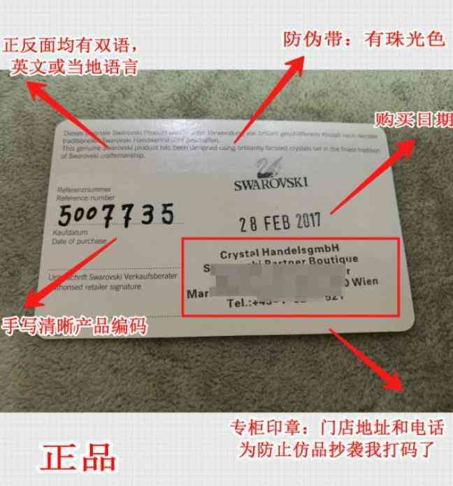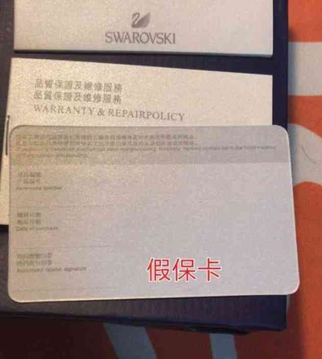 有人说早在2015年施华洛世奇就把保修卡取消了。事实上,情况并非完全如此。有些柜台还配有保修卡。保修卡是享受售后服务的核心配件。正品保卡上有珠光色(有反光),背面上方有一条防伪带(清晰珠光色),右下角一栏是专柜印章信息(门店地址和电话),印章上方或左侧是门店出货日期,左侧上方是手写产品编号(7位数),编号和吊牌上以及包装贴纸上的编号一致。