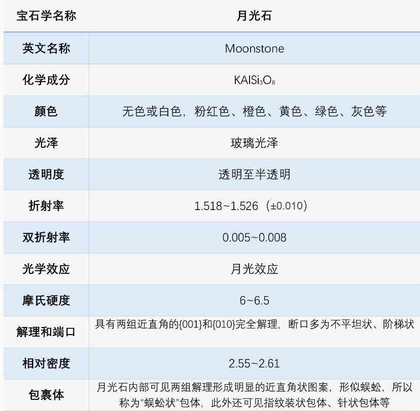 月光石属于正长石系列,通常被划分到正长石(KAlSi3O8),但实际上月光石是正长石(KAlSi3O8)和钠长石(NaAlSi3O8)两种成分层状交互共生的矿物宝石。其宝石学性质见表-1。