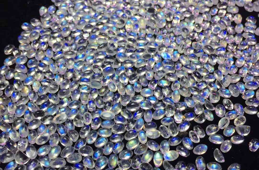 斯里兰卡和缅甸产出的月光石质量较优,印度的月光石体色变化比较多样。斯里兰卡的月光石大颗无暇的相对较多一些,有少部分晶体通透,成无色透明玻璃体;缅甸月光石晶体一般较好,玻璃体,蓝光偏弱;印度产的月光石有体色变化,颜色右边白色、红棕色、蓝色,绿色,大部分晶体的冰纹棉裂比较多,因为无需避开冰纹棉裂,所以加工的时候可以保留大块,被加工成圆珠、雕件等(徐文容,2020)。