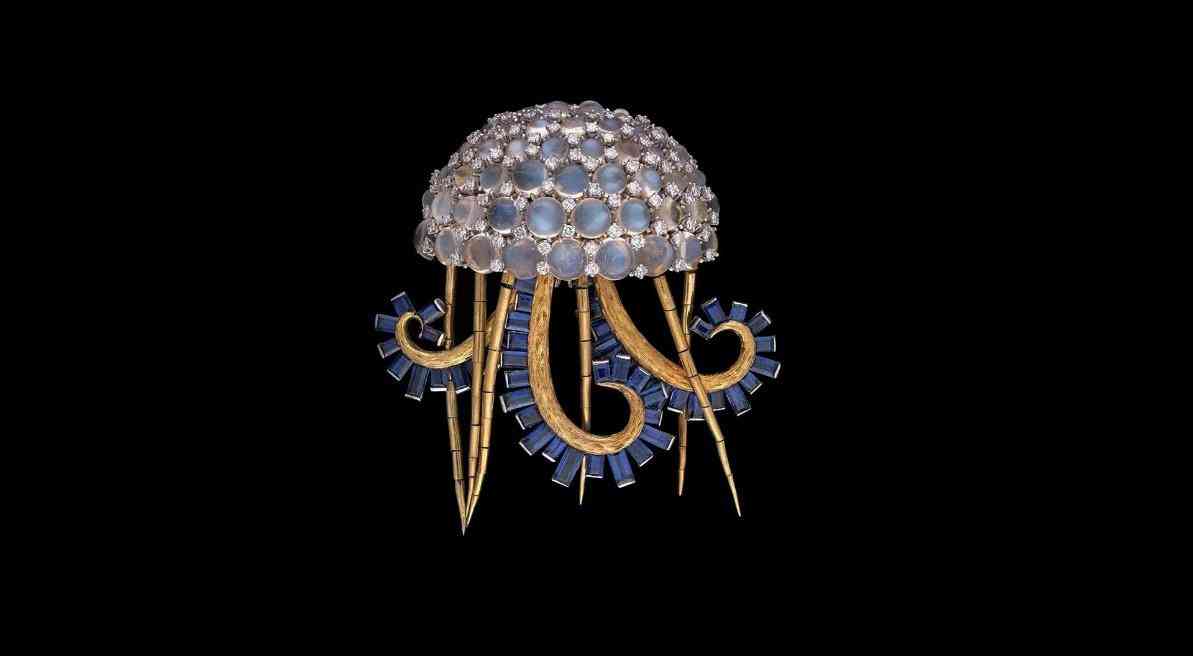 当年美国园艺学家梅隆夫人在海滩上被一只水母蛰伤,旋即向Tiffany订制了一枚水母胸针作为纪念,设计师Jean Schlumberger将弧面形月光石加工成拱顶状来模仿水母的伞状外形,朦胧的蓝色光泽恰好与水母透明的身体相似,下方的K金流苏模拟水母的触须,还可见三个点缀长方形阶梯的蓝宝石,用以表示蛰伤梅隆夫人的刺(此解释源于网络)。