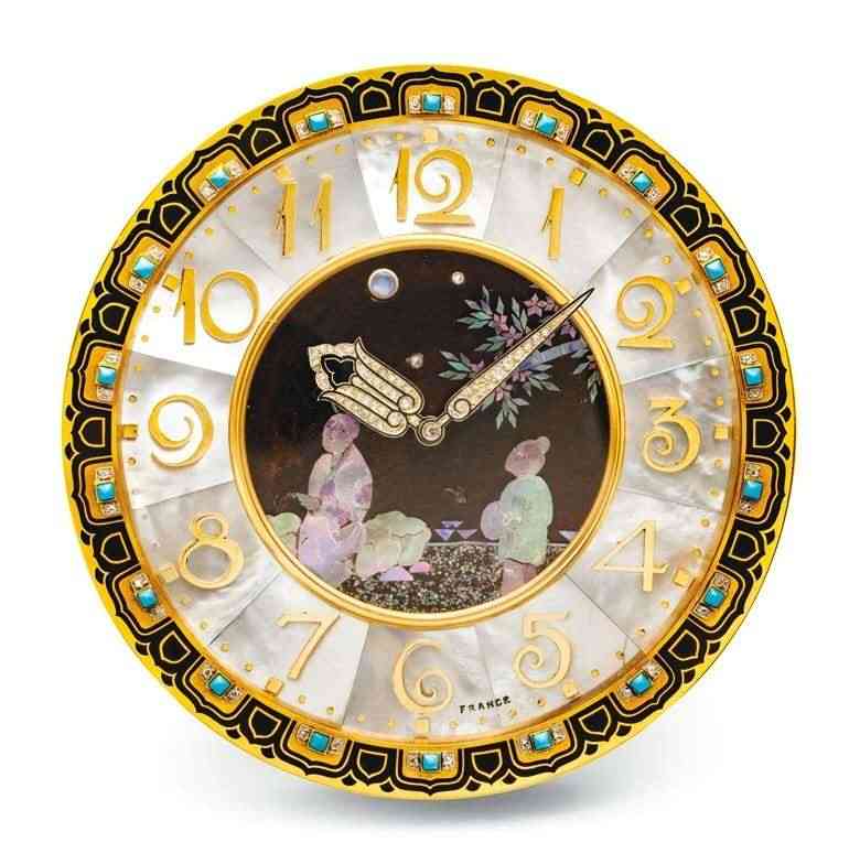 卡地亚开始从亚洲元素汲取灵感,制作饰以装饰艺术时期图案的座钟。Marie-Cécile解说:"涂上珐琅或镶嵌钻石的黄金指针呈心形、箭形或波斯郁金香形,而蓝宝石和红宝石则通常取代过往点缀底座的钻石星星。"