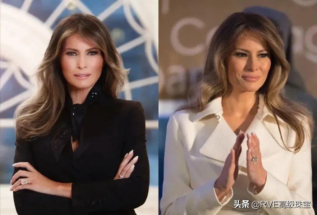大克拉爱好者少不了梅拉尼娅,是美国前总统特朗普为纪念两人结婚十周年而送她的25克拉大钻戒,来自珠宝品牌Graff,戒指价值300万美元。。