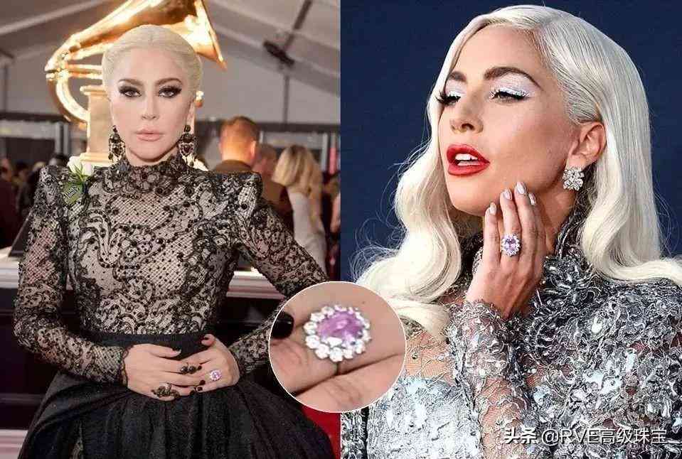 Lady Gaga也有一枚粉色钻戒,是经纪人男友Christian Carino送的。这枚戒指差不多在11克拉到13克拉之间,周围还有一圈无色钻石,形状也很花哨~
