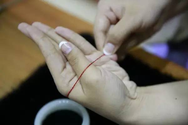 步骤一:把大拇指移到小拇指的指根处,并用细线测量手掌最宽处的周长。